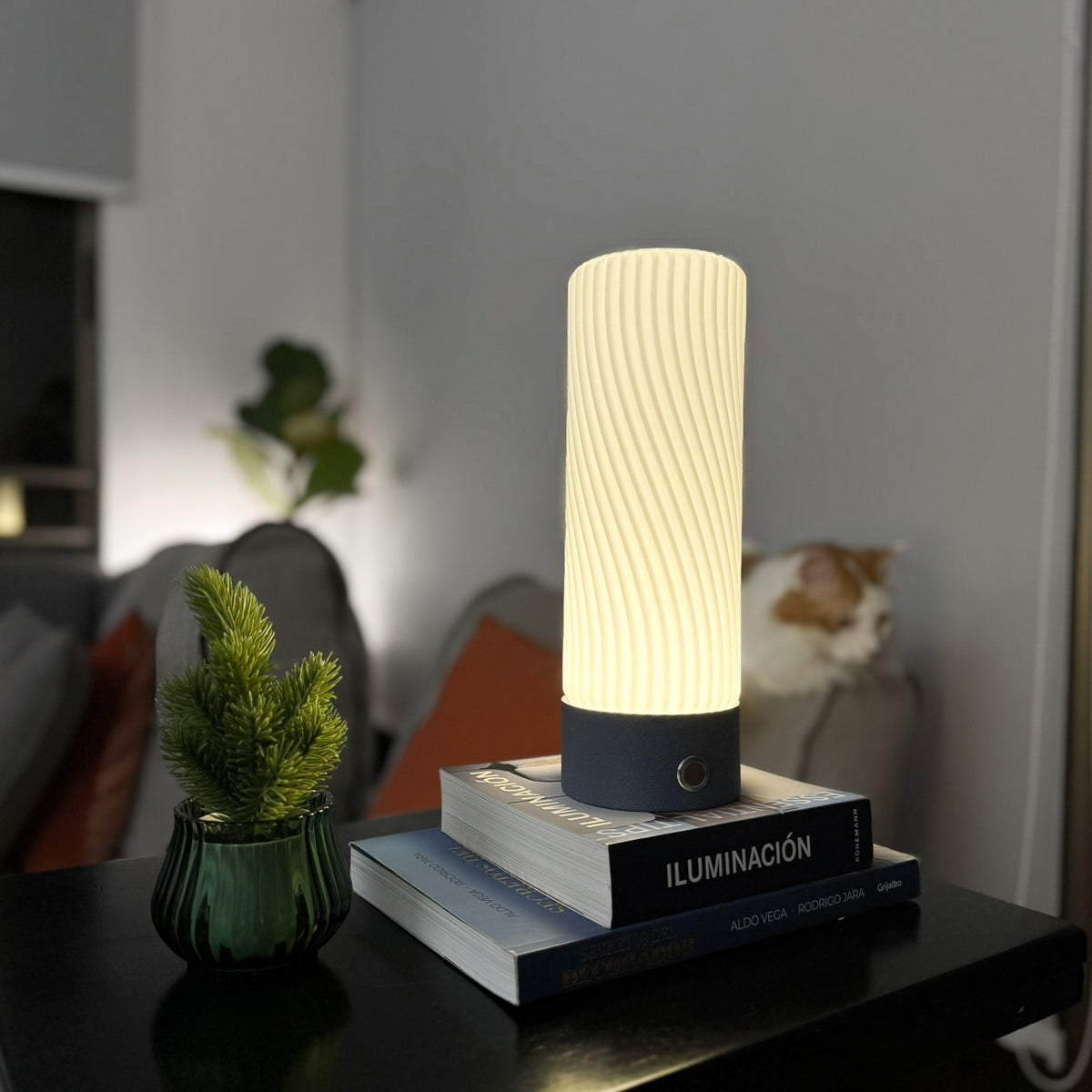 Lámpara Recargable Modelo SPIN. Diseñada y fabricada con tecnología 3D. Ilumina hasta 6 horas con su máxima potencia. (más de 11 horas en potencia mínima)