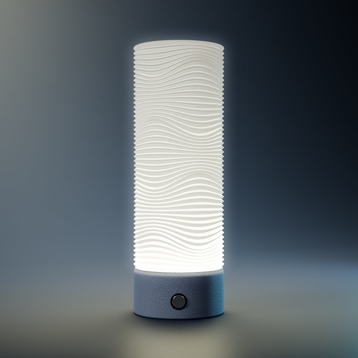 Lámpara Recargable Modelo WAVE. Diseñada y fabricada con tecnología 3D. Ilumina hasta 3 horas con su máxima potencia.